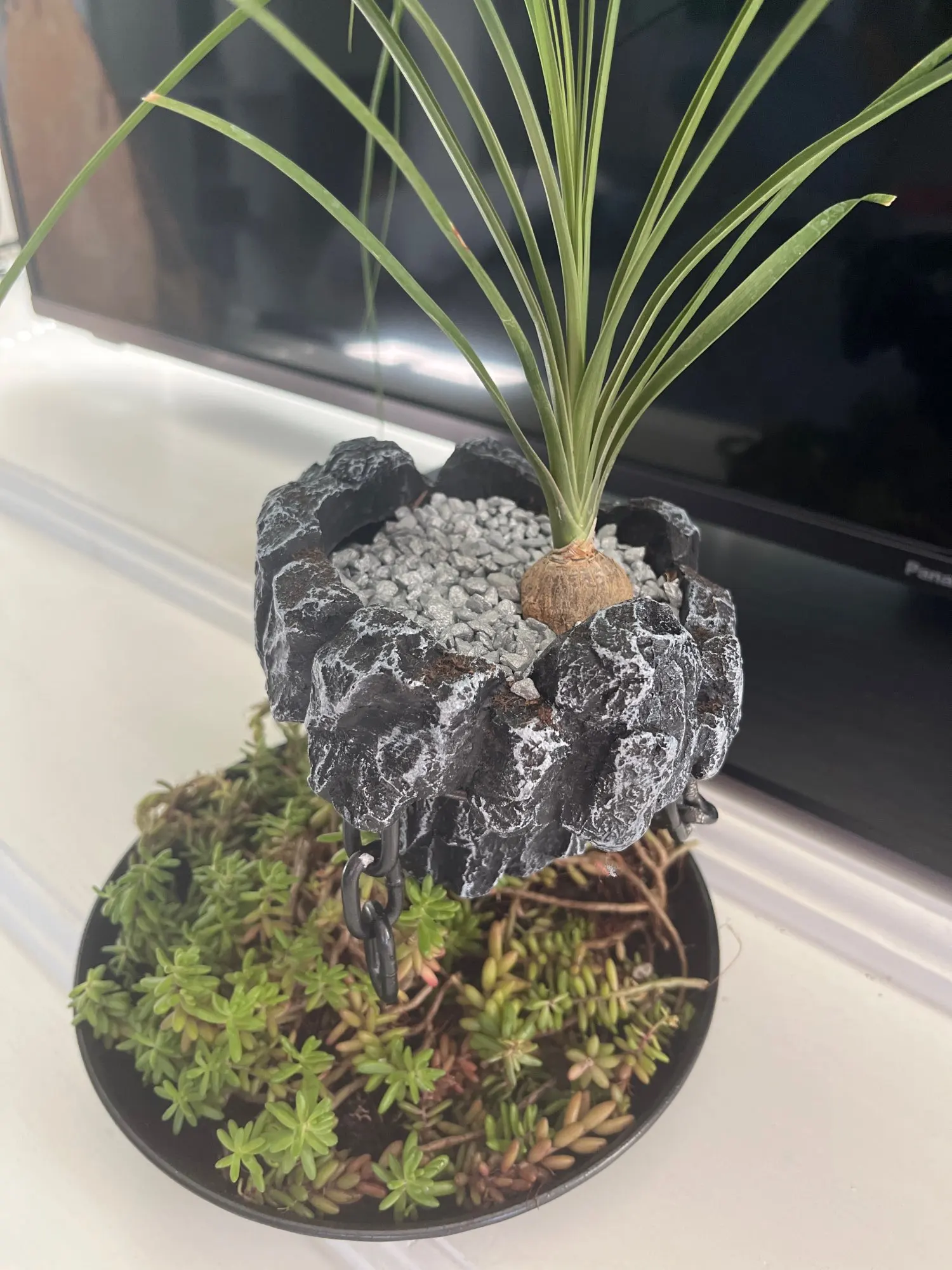 These Rockery Decoration Plant Pots are tailored for small indoor bonsai, succulents, orchids, and other petite plants, offering a unique floating style "suspended" by a decorative iron chain twine accented with an elegant butterfly.