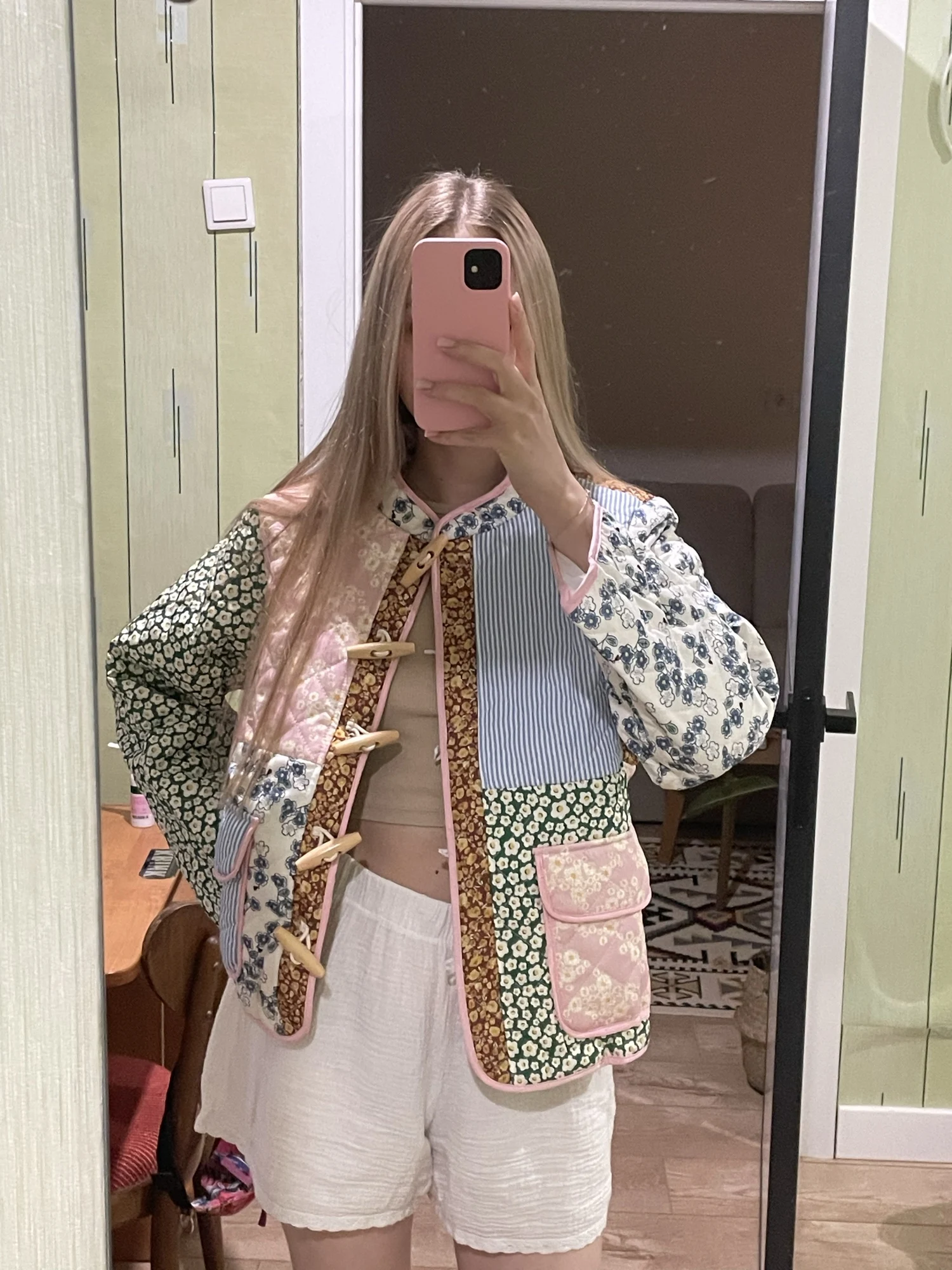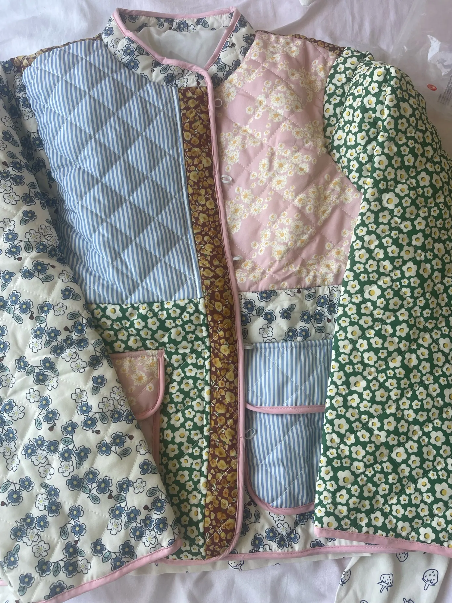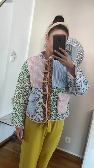 I like the color and pattern, patchwork is definitely a hit for autumn 2025 and spring 2026. The only thing I could improve is the sleeve length; I usually wear size M for everyday wear. Here I ordered M and L, and I think L fits better.